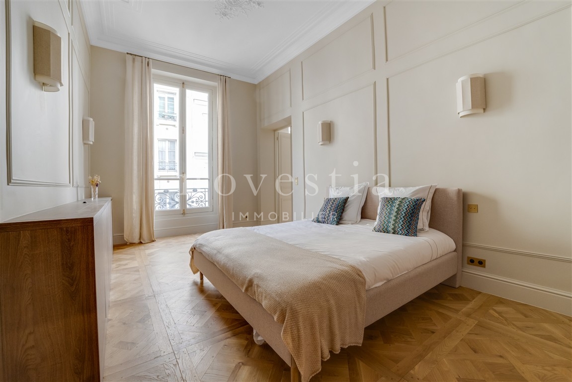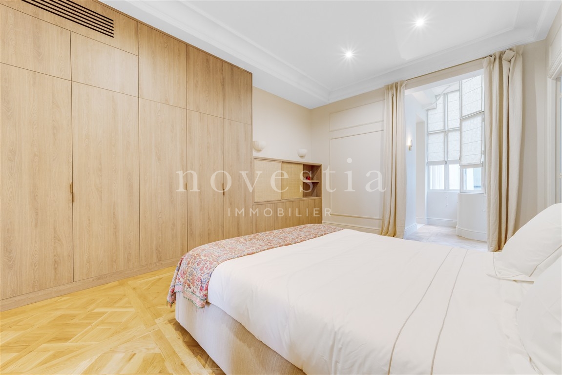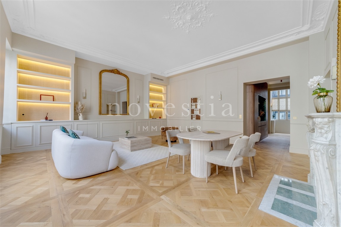 RUE DES SAINTS-PÈRES - À QUELQUES PAS DU BOULEVARD SAINT-GERMAIN - Seul sur le palier, au deuxième étage d'un bel immeuble ancien équipé d'un ascenseur, un magnifique appartement de 148 m² au sol (146 m² Loi Carrez) entièrement rénové en 2025 avec des matériaux haut de gamme. Ce bien comprend une entrée, une cuisine ouverte et équipée, un magnifique séjour avec une hauteur sous plafond de 3,70 m, deux suites climatisées avec pour chacune sa propre salle de bains équipée de wc et de nombreux rangements, une buanderie, ainsi que des wc invités. Appartement clé en main, entièrement rénové, bénéficiant de prestations haut de gamme, de beaux volumes, avec du parquet Versaillais, du double vitrage, l'air conditionné, une très belle luminosité, de nombreux rangements et un plan équilibré et confortable. Adresse exceptionnelle. Idéal pour un pied à terre.