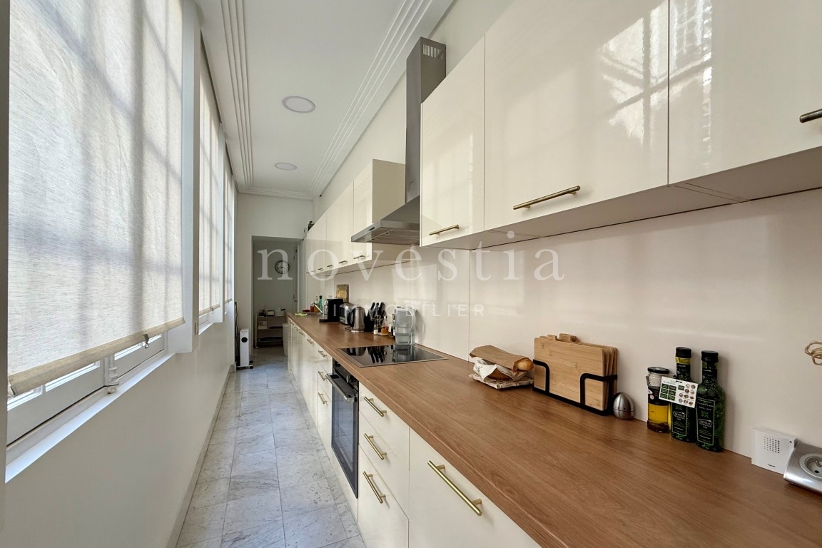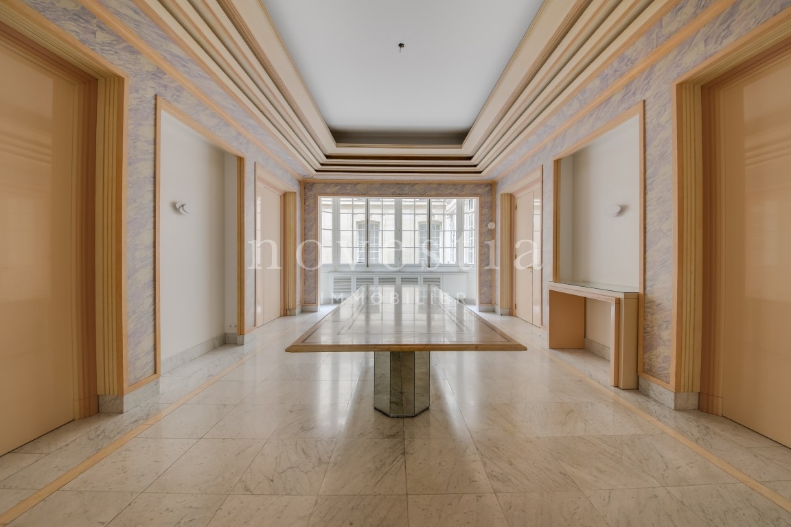 PARIS VIII - AVENUE MARCEAU - À PROXIMITÉ DE L'ALMA - EN FACE DU MUSÉE YVES SAINT LAURENT Au deuxième étage d’un bel immeuble haussmannien équipé d’un ascenseur, nous vous proposons un appartement traversant de 403 m². Seul sur le palier, l'appartement comprend une galerie d’entrée, une double réception, un balcon filant de 10 m, une salle à manger, deux cuisines, deux suites avec chacune sa salle de bains, ses WC et son dressing, trois autres chambres, une salle de bains, une salle d’eau, ainsi que des WC invités. Appartement à rénover, avec du marbre, du parquet, une entrée de service et une hauteur sous plafond de 3,70 mètres. Une cave vient compléter ce bien. Gardien dans l'immeuble.