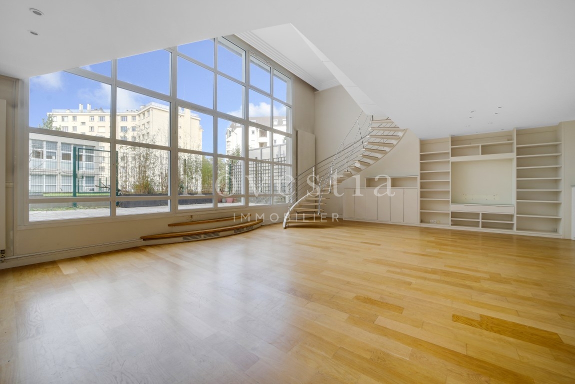 PARIS 19E - DANS LE QUARTIER DES BUTTES CHAUMONT - À QUELQUES PAS DU QUARTIER DE LA MOUZAÏA - Au premier étage d'un immeuble semi-récent très bien entretenue, un loft en duplex de 150 m² au sol (146.93 m² Carrez) donnant sur une terrasse de 37 m². Ce bien hors normes comprend une entrée, un vaste double séjour de 66m² exposé plein ouest avec une hauteur sous plafond de 5.20 mètres et bénéficiant d'une fenêtre magistrale style atelier d'artiste et d'un accès à une terrasse ensoleillée donnant sur un jardin, une cuisine américaine, ainsi qu'un wc invités. À l'étage se trouvent deux chambres dont la première avec une vaste salle de bains équipée de wc, la seconde avec sa salle d'eau également équipée de WC, ainsi qu'un grand dressing indépendant. Appartement exceptionnel, avec du parquet, du double vitrage, sans vis-à-vis immédiat, et de nombreux rangements. Transports à proximité. Gardienne. En supplément du prix : Une double place de parking dans l'immeuble au prix de 31.200€ FAI.