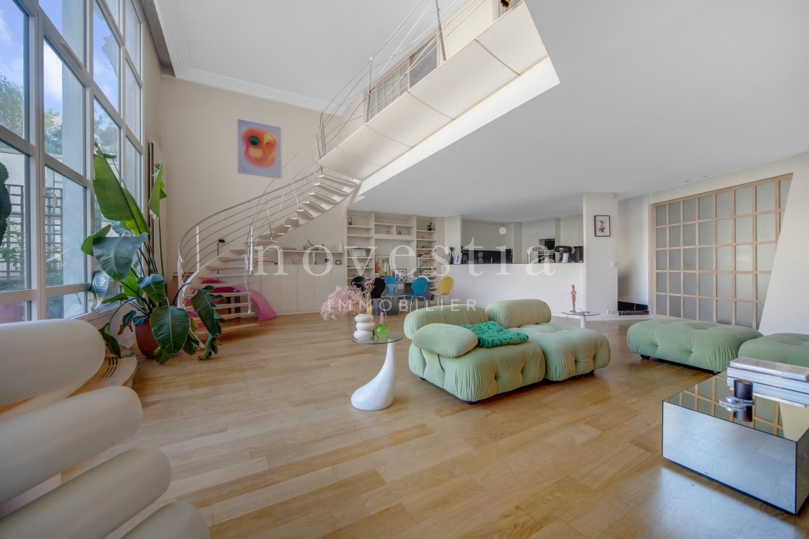 EXCLUSIVITÉ - PARIS 19E - DANS LE QUARTIER DES BUTTES CHAUMONT - À QUELQUES PAS DU QUARTIER DE LA MOUZAÏA - Au premier étage d'un immeuble semi-récent très bien entretenue, un loft en duplex de 150 m² au sol (146.93 m² Carrez) donnant sur une terrasse de 37 m². Ce bien hors normes comprend une entrée, un vaste double séjour de 66m² exposé plein ouest avec une hauteur sous plafond de 5.20 mètres et bénéficiant d'une fenêtre magistrale style atelier d'artiste et d'un accès à une terrasse ensoleillée donnant sur un jardin, une cuisine américaine, ainsi qu'un wc invités. À l'étage se trouvent deux chambres dont la première avec une vaste salle de bains équipée de wc, la seconde avec sa salle d'eau également équipée de WC, ainsi qu'un grand dressing indépendant. Appartement exceptionnel, avec du parquet, du double vitrage, sans vis-à-vis immédiat, et de nombreux rangements. Transports à proximité. Gardienne. En supplément du prix : Une double place de parking dans l'immeuble au prix de 31.200€ FAI.