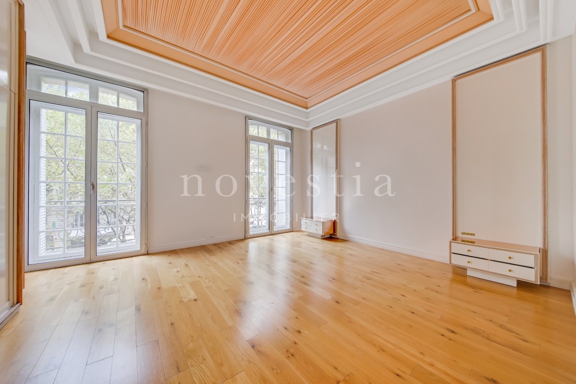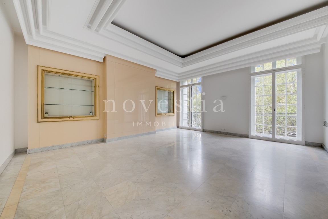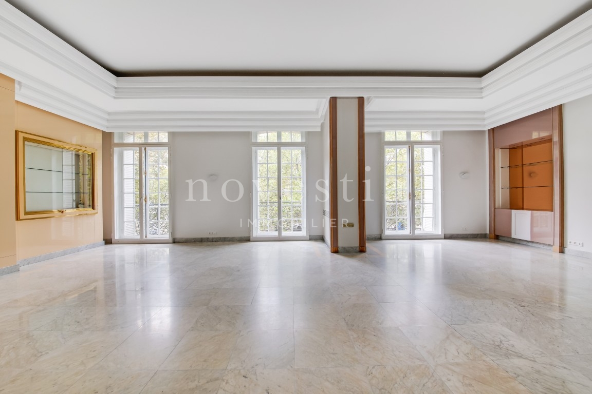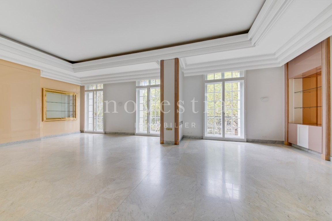 PARIS VIII - AVENUE MARCEAU - À PROXIMITÉ DE L'ALMA - EN FACE DU MUSÉE YVES SAINT LAURENT Au deuxième étage d’un bel immeuble haussmannien équipé d’un ascenseur, nous vous proposons un appartement traversant de 403 m². Seul sur le palier, l'appartement comprend une galerie d’entrée, une double réception, un balcon filant de 10 m, une salle à manger, deux cuisines, deux suites avec chacune sa salle de bains, ses WC et son dressing, trois autres chambres, une salle de bains, une salle d’eau, ainsi que des WC invités. Appartement à rénover, avec du marbre, du parquet, une entrée de service et une hauteur sous plafond de 3,70 mètres. Une cave vient compléter ce bien. Gardien dans l'immeuble.
