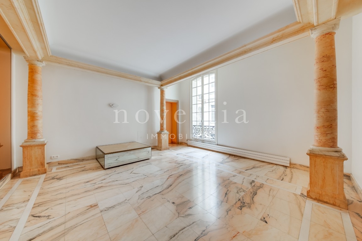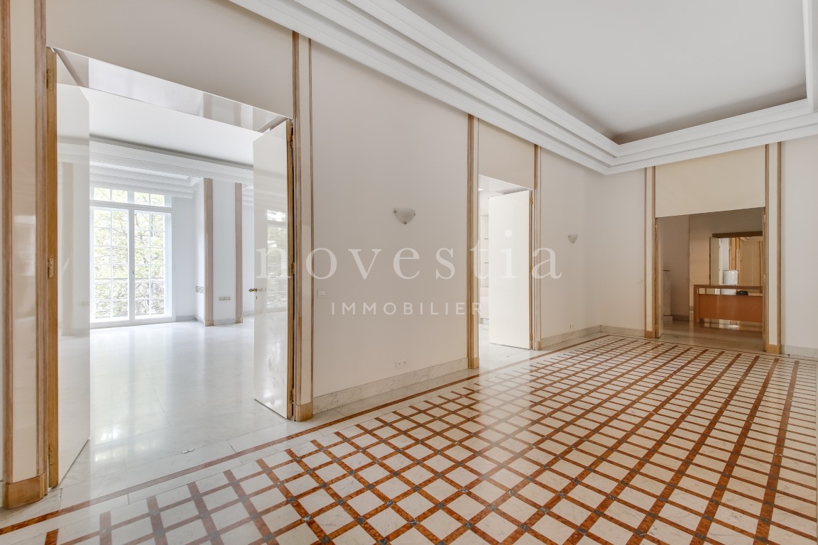 PARIS VIII - AVENUE MARCEAU - À PROXIMITÉ DE L'ALMA - EN FACE DU MUSÉE YVES SAINT LAURENT Au deuxième étage d’un bel immeuble haussmannien équipé d’un ascenseur, nous vous proposons un appartement traversant de 403 m². Seul sur le palier, l'appartement comprend une galerie d’entrée, une double réception, un balcon filant de 10 m, une salle à manger, deux cuisines, deux suites avec chacune sa salle de bains, ses WC et son dressing, trois autres chambres, une salle de bains, une salle d’eau, ainsi que des WC invités. Appartement à rénover, avec du marbre, du parquet, une entrée de service et une hauteur sous plafond de 3,70 mètres. Une cave vient compléter ce bien. Gardien dans l'immeuble.