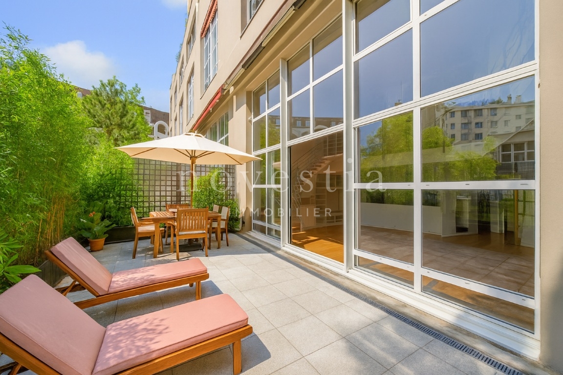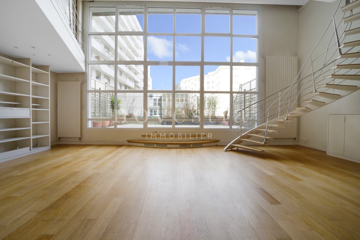 PARIS 19E - DANS LE QUARTIER DES BUTTES CHAUMONT - À QUELQUES PAS DU QUARTIER DE LA MOUZAÏA - Au premier étage d'un immeuble semi-récent très bien entretenue, un loft en duplex de 150 m² au sol (146.93 m² Carrez) donnant sur une terrasse de 37 m². Ce bien hors normes comprend une entrée, un vaste double séjour de 66m² exposé plein ouest avec une hauteur sous plafond de 5.20 mètres et bénéficiant d'une fenêtre magistrale style atelier d'artiste et d'un accès à une terrasse ensoleillée donnant sur un jardin, une cuisine américaine, ainsi qu'un wc invités. À l'étage se trouvent deux chambres dont la première avec une vaste salle de bains équipée de wc, la seconde avec sa salle d'eau également équipée de WC, ainsi qu'un grand dressing indépendant. Appartement exceptionnel, avec du parquet, du double vitrage, sans vis-à-vis immédiat, et de nombreux rangements. Transports à proximité. Gardienne. En supplément du prix : Une double place de parking dans l'immeuble au prix de 31.200€ FAI.