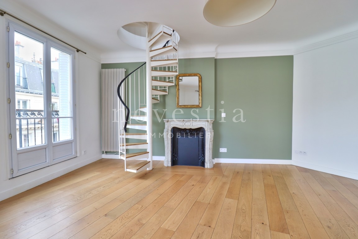 PARIS XVII - ENTRE LA RUE DE COURCELLES ET LA RUE DE PRONY - Au 5e et 6e étage d’un immeuble en pierre de taille équipé d’un ascenseur, nous vous proposons un très bel appartement de 126,43 m² Loi Carrez avec un balcon filant. Cet appartement comprend au premier niveau, une entrée, un double séjour donnant sur le balcon, une cuisine indépendante, trois chambres dont deux ayant un accès au balcon, une salle de bains avec WC ainsi qu'un WC séparé. Au second niveau, une chambre et sa salle d'eau donnant sur deux balcons. Appartement entièrement rénové en 2022, parquet, cheminée et vue dégagée. Une cave complète ce bien. À proximité immédiate du parc Monceau, de la rue de Courcelles et de ses nombreux commerces ainsi que des transports. Sectorisation Carnot.