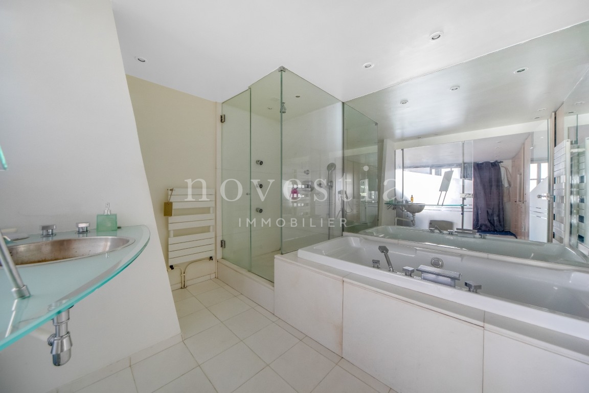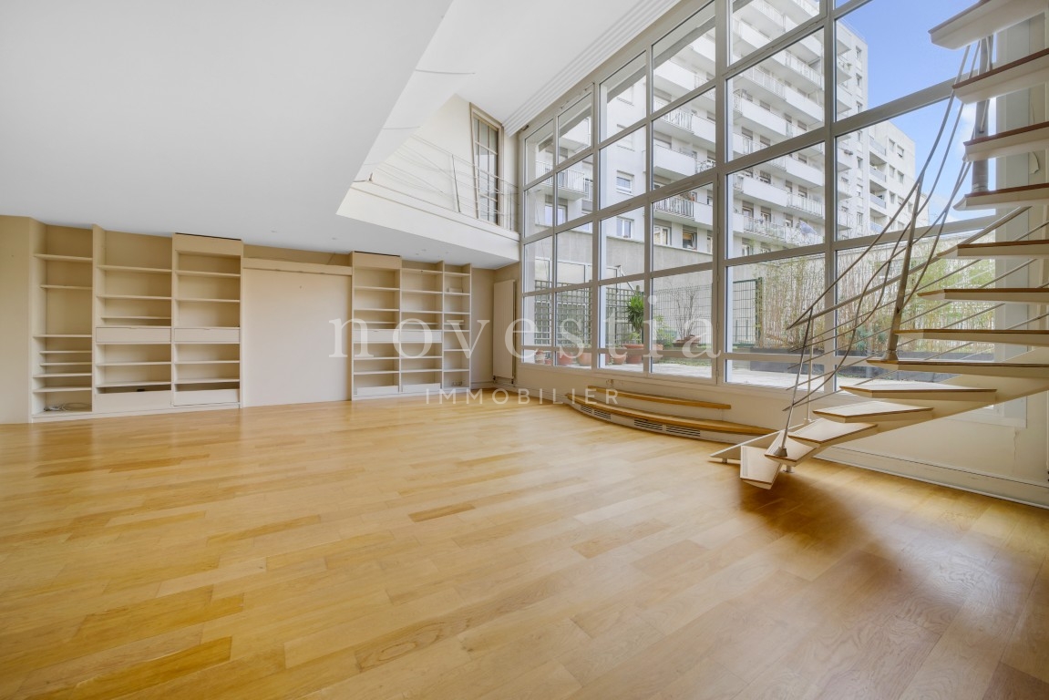 PARIS 19E - DANS LE QUARTIER DES BUTTES CHAUMONT - À QUELQUES PAS DU QUARTIER DE LA MOUZAÏA - Au premier étage d'un immeuble semi-récent très bien entretenue, un loft en duplex de 150 m² au sol (146.93 m² Carrez) donnant sur une terrasse de 37 m². Ce bien hors normes comprend une entrée, un vaste double séjour de 66m² exposé plein ouest avec une hauteur sous plafond de 5.20 mètres et bénéficiant d'une fenêtre magistrale style atelier d'artiste et d'un accès à une terrasse ensoleillée donnant sur un jardin, une cuisine américaine, ainsi qu'un wc invités. À l'étage se trouvent deux chambres dont la première avec une vaste salle de bains équipée de wc, la seconde avec sa salle d'eau également équipée de WC, ainsi qu'un grand dressing indépendant. Appartement exceptionnel, avec du parquet, du double vitrage, sans vis-à-vis immédiat, et de nombreux rangements. Transports à proximité. Gardienne. En supplément du prix : Une double place de parking dans l'immeuble au prix de 31.200€ FAI.