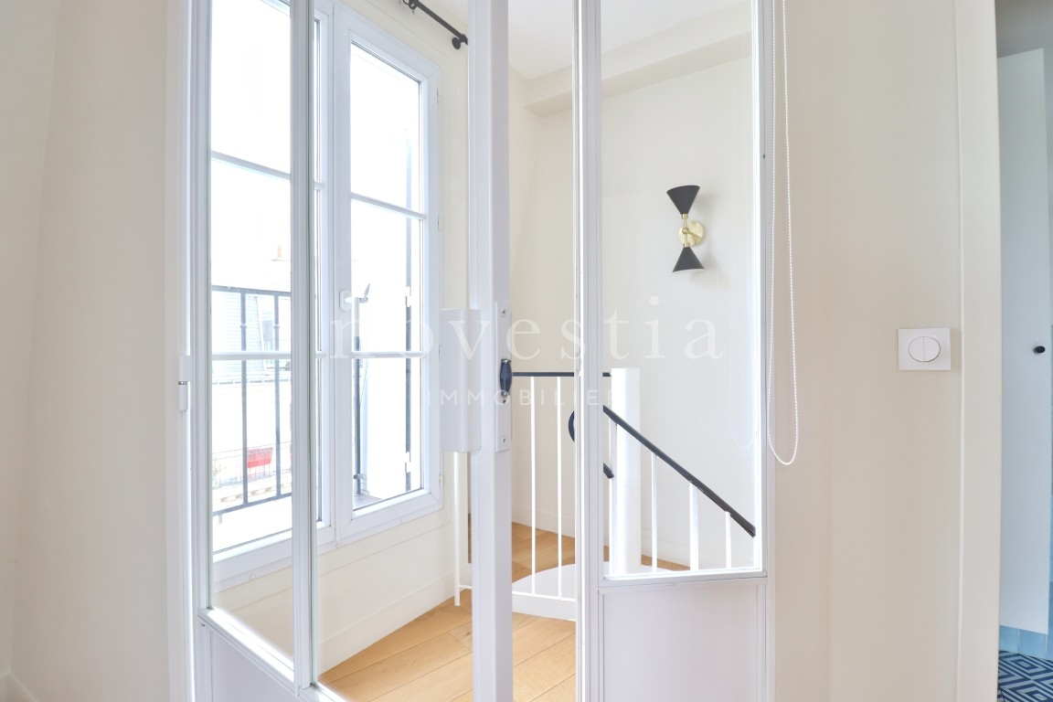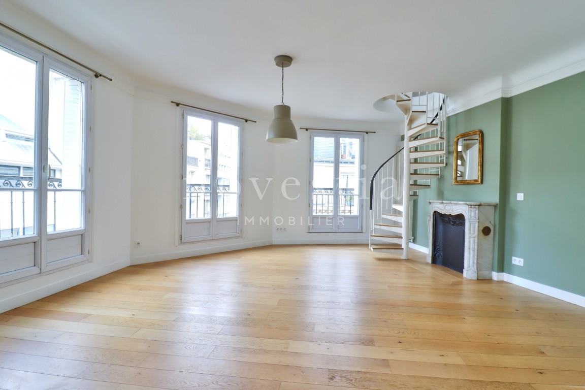 PARIS XVII - ENTRE LA RUE DE COURCELLES ET LA RUE DE PRONY - Au 5e et 6e étage d’un immeuble en pierre de taille équipé d’un ascenseur, nous vous proposons un très bel appartement de 126,43 m² Loi Carrez avec un balcon filant. Cet appartement comprend au premier niveau, une entrée, un double séjour donnant sur le balcon, une cuisine indépendante, trois chambres dont deux ayant un accès au balcon, une salle de bains avec WC ainsi qu'un WC séparé. Au second niveau, une chambre et sa salle d'eau donnant sur deux balcons. Appartement entièrement rénové en 2022, parquet, cheminée et vue dégagée. Une cave complète ce bien. À proximité immédiate du parc Monceau, de la rue de Courcelles et de ses nombreux commerces ainsi que des transports. Sectorisation Carnot.