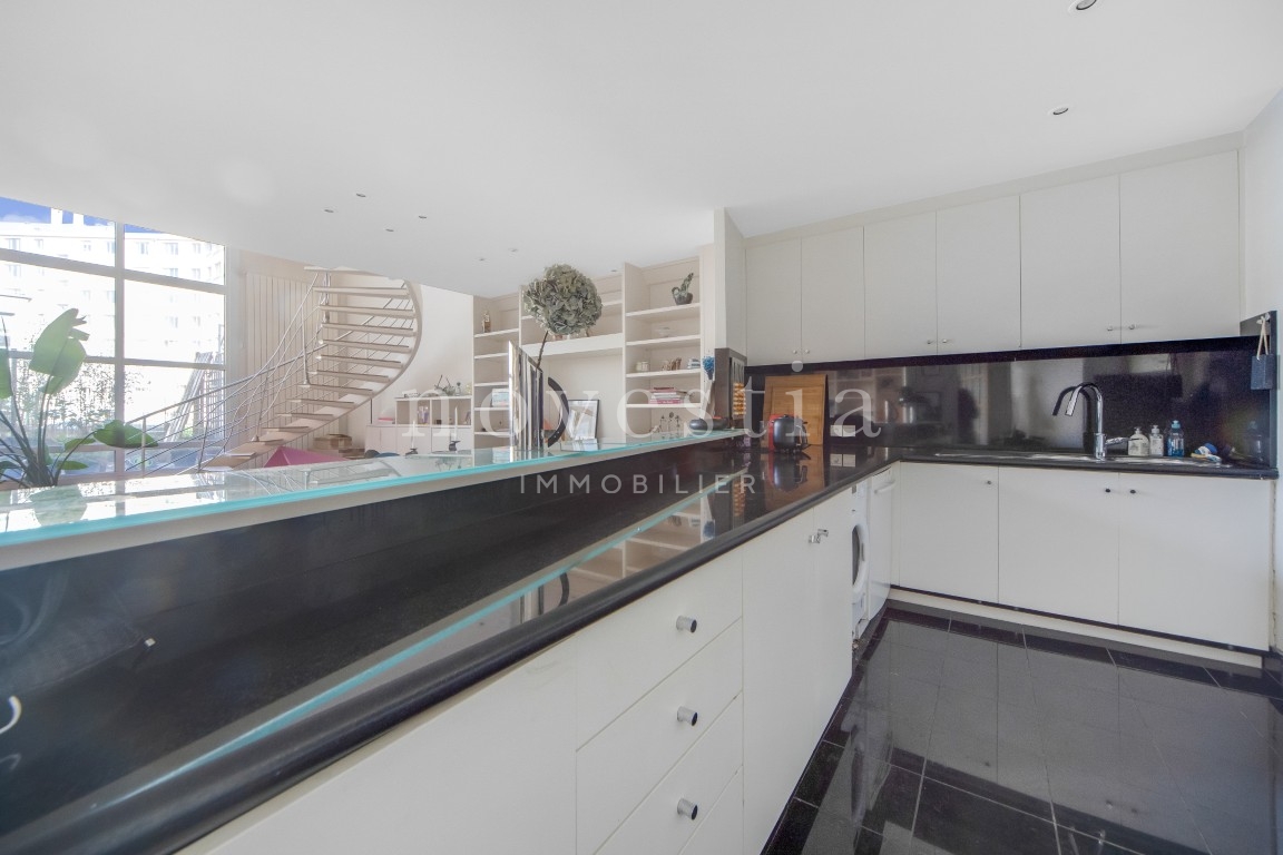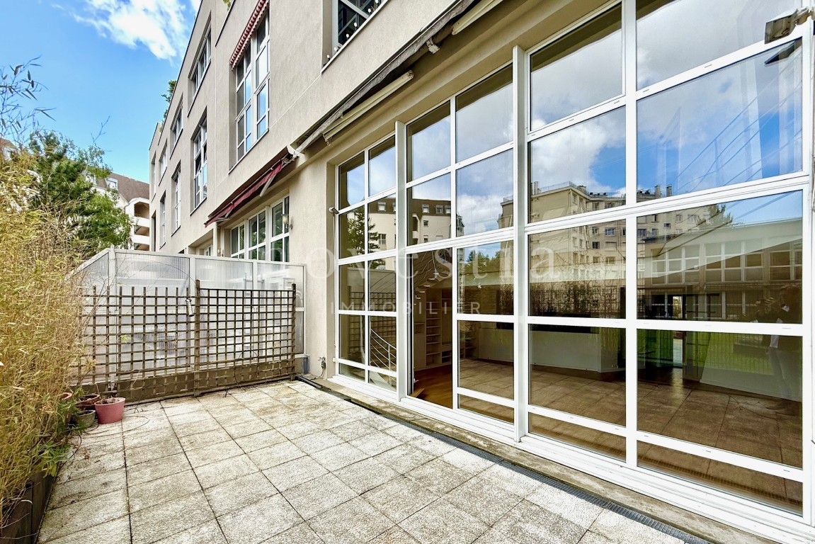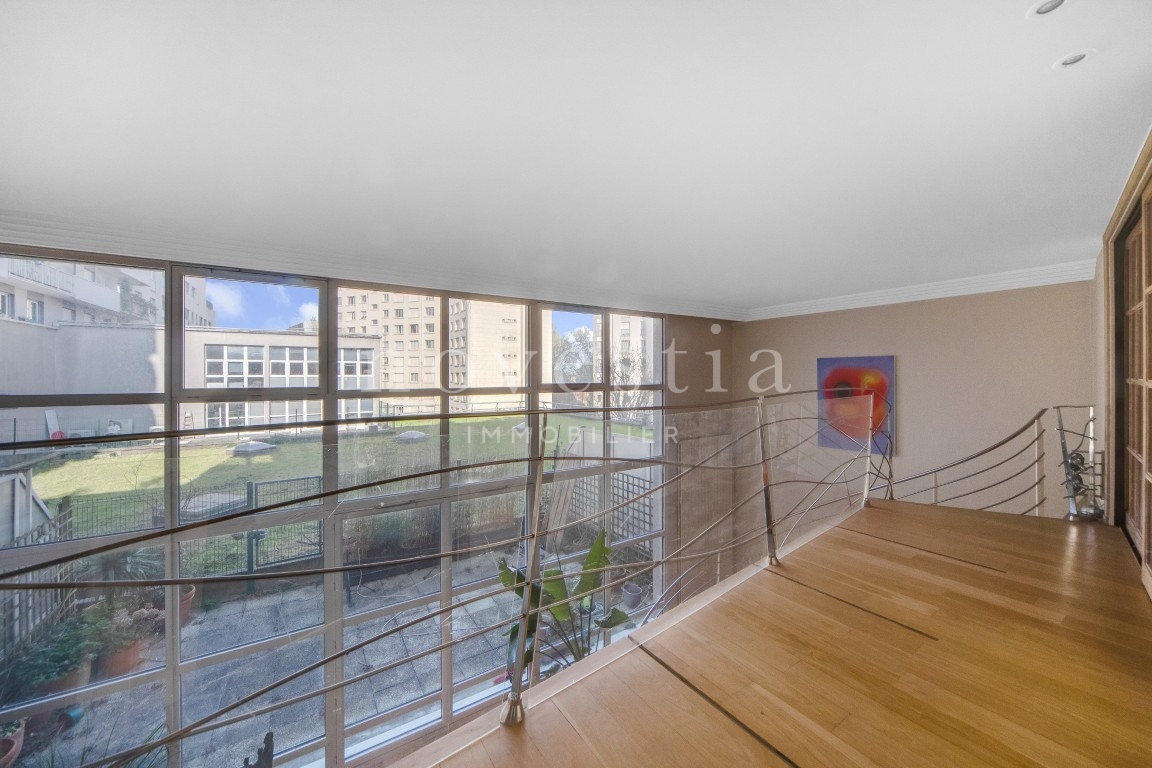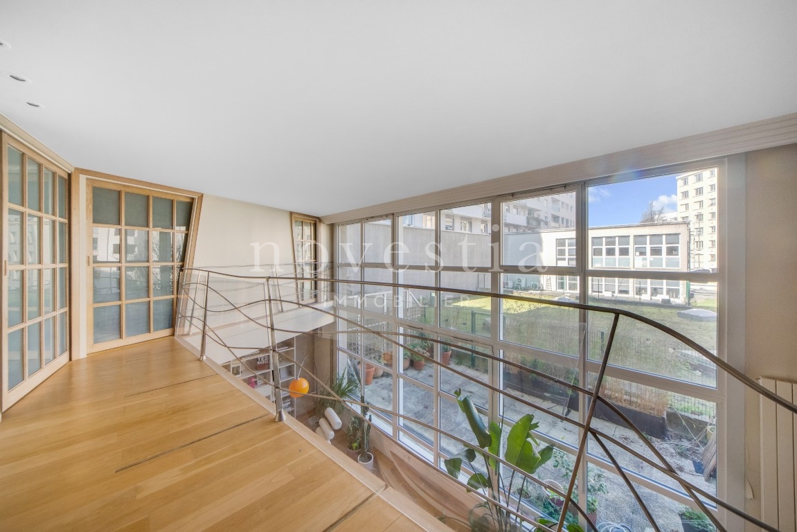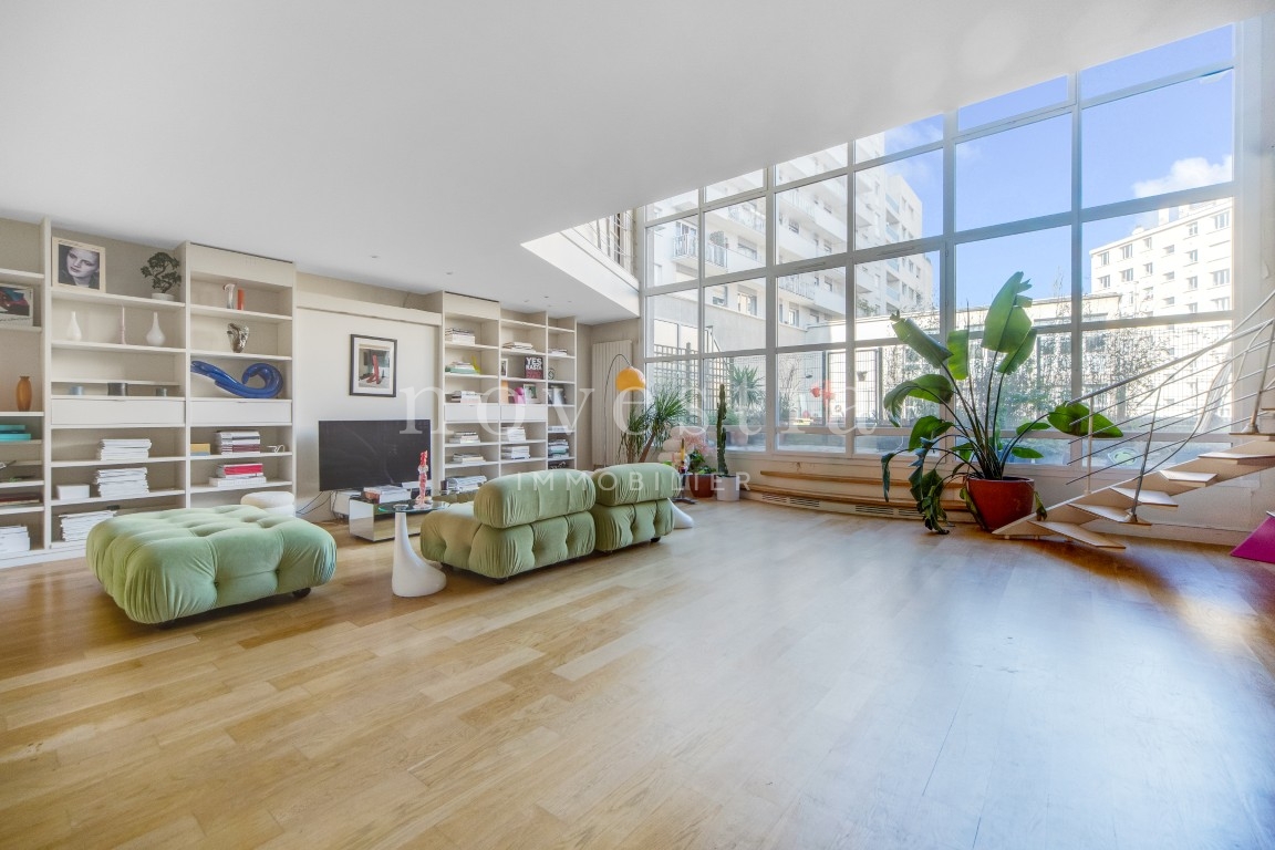 EXCLUSIVITÉ - PARIS 19E - DANS LE QUARTIER DES BUTTES CHAUMONT - À QUELQUES PAS DU QUARTIER DE LA MOUZAÏA - Au premier étage d'un immeuble semi-récent très bien entretenue, un loft en duplex de 150 m² au sol (146.93 m² Carrez) donnant sur une terrasse de 37 m². Ce bien hors normes comprend une entrée, un vaste double séjour de 66m² exposé plein ouest avec une hauteur sous plafond de 5.20 mètres et bénéficiant d'une fenêtre magistrale style atelier d'artiste et d'un accès à une terrasse ensoleillée donnant sur un jardin, une cuisine américaine, ainsi qu'un wc invités. À l'étage se trouvent deux chambres dont la première avec une vaste salle de bains équipée de wc, la seconde avec sa salle d'eau également équipée de WC, ainsi qu'un grand dressing indépendant. Appartement exceptionnel, avec du parquet, du double vitrage, sans vis-à-vis immédiat, et de nombreux rangements. Transports à proximité. Gardienne. En supplément du prix : Une double place de parking dans l'immeuble au prix de 31.200€ FAI.