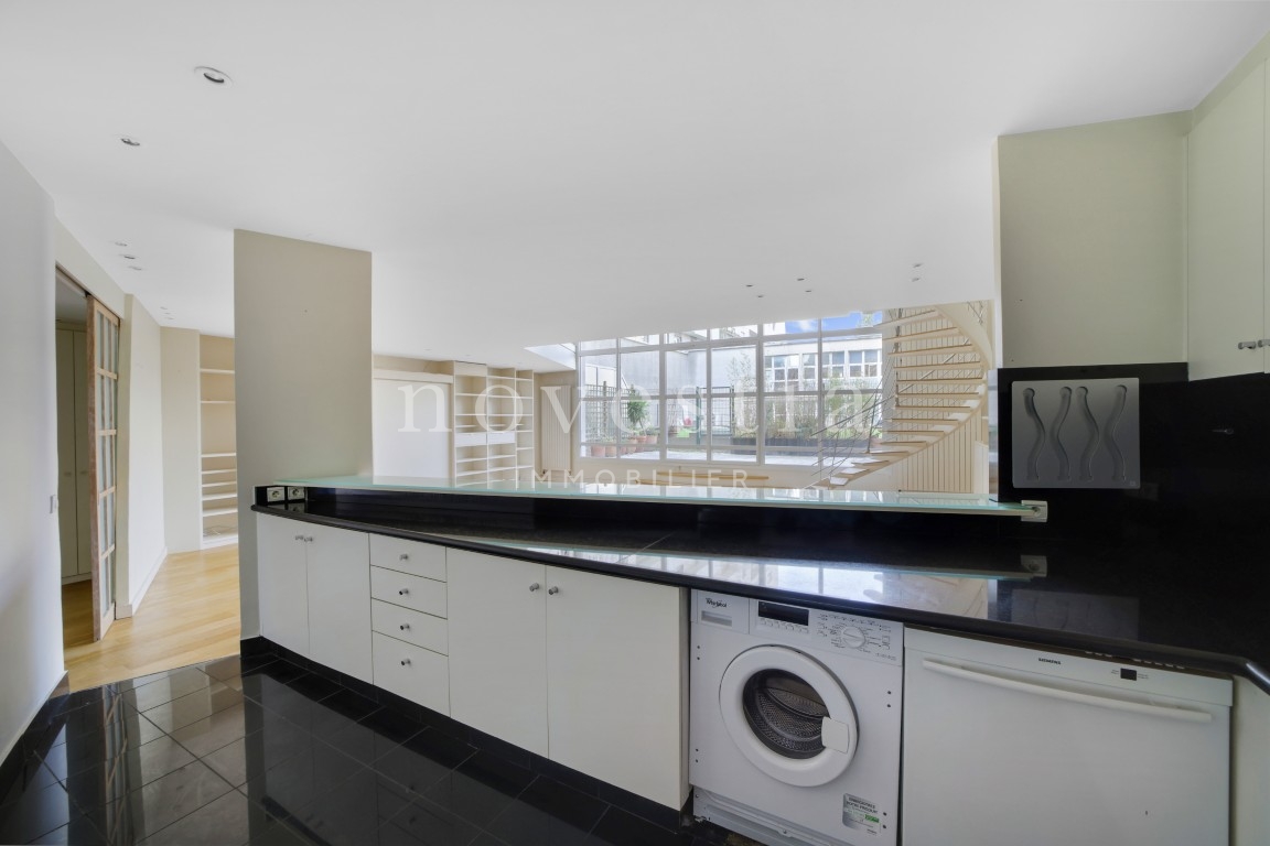 PARIS 19E - DANS LE QUARTIER DES BUTTES CHAUMONT - À QUELQUES PAS DU QUARTIER DE LA MOUZAÏA - Au premier étage d'un immeuble semi-récent très bien entretenue, un loft en duplex de 150 m² au sol (146.93 m² Carrez) donnant sur une terrasse de 37 m². Ce bien hors normes comprend une entrée, un vaste double séjour de 66m² exposé plein ouest avec une hauteur sous plafond de 5.20 mètres et bénéficiant d'une fenêtre magistrale style atelier d'artiste et d'un accès à une terrasse ensoleillée donnant sur un jardin, une cuisine américaine, ainsi qu'un wc invités. À l'étage se trouvent deux chambres dont la première avec une vaste salle de bains équipée de wc, la seconde avec sa salle d'eau également équipée de WC, ainsi qu'un grand dressing indépendant. Appartement exceptionnel, avec du parquet, du double vitrage, sans vis-à-vis immédiat, et de nombreux rangements. Transports à proximité. Gardienne. En supplément du prix : Une double place de parking dans l'immeuble au prix de 31.200€ FAI.